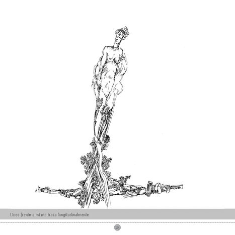 En una primera lectura abro el libro, me enfrento a lo ahí propuesto y bisbiseo: lo femenino, siempre algo más armónico que lo masculino. Cuerpos que se doblan, cuerpos que se amalgaman, cuerpos que bailan. Luego pregunto, ¿a qué obedece mi juicio, a la regla o a la emoción? Y sigo: Veo un hombre pequeño, desfragmentado, caótico y ruidoso, marginado a la sombra de unas caderas altas, enormes y limpias que soportan un vientre florecido en partituras y vegetales grafías. Veo cuerpos mezclándose en un cardumen imposible de dolor y deseo, mujeres elevándose desde sus tacones rojos sobre obscenas urbes y maltrechas casas, sobre pervertidas cúpulas de iglesias. Entonces, repaso, verifico, cotejo los trazos, exploro los cimientos y surge el inveniet de curvas invisibles que se alejan de su origen, surge la danza creciente de un centro que lucha contra su entorno circundante. Se devela la espiral que soporta la creación del mundo físico, el desdoblamiento del alma abandonando el centro, viajando a las aristas del exterior donde todo es vértigo y progresiva búsqueda de lo imposible.